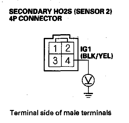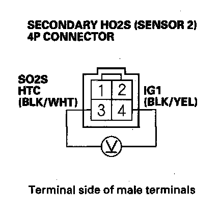 11. Measure voltage between secondary HO2S (Sensor 2) 4P connector terminals No. 3 and No. 4.