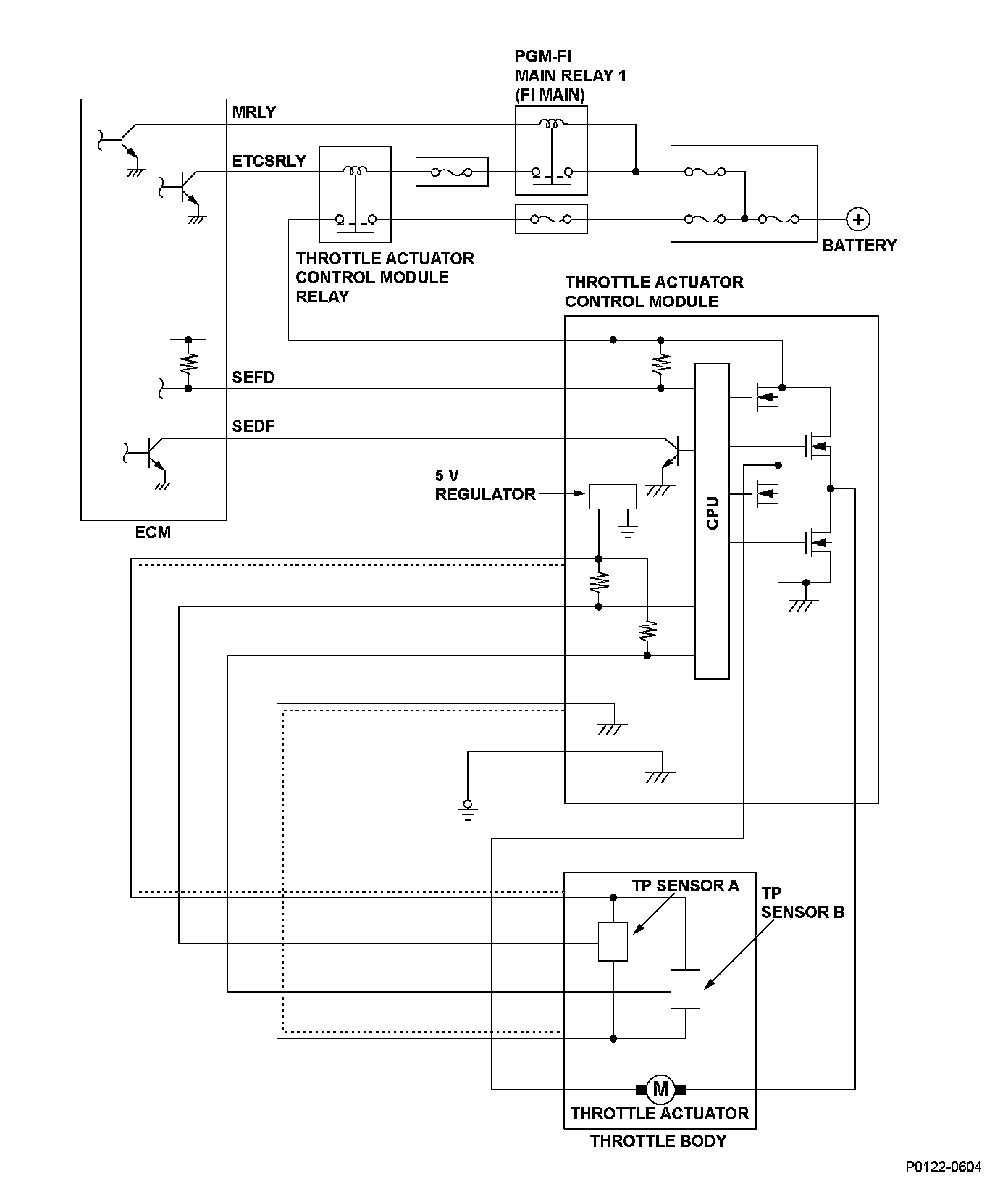 The throttle valve position signal from TP sensor B is transmitted to the throttle actuator control module for target position feedback control, then to the engine control module (ECM) as an actual throttle valve position signal.