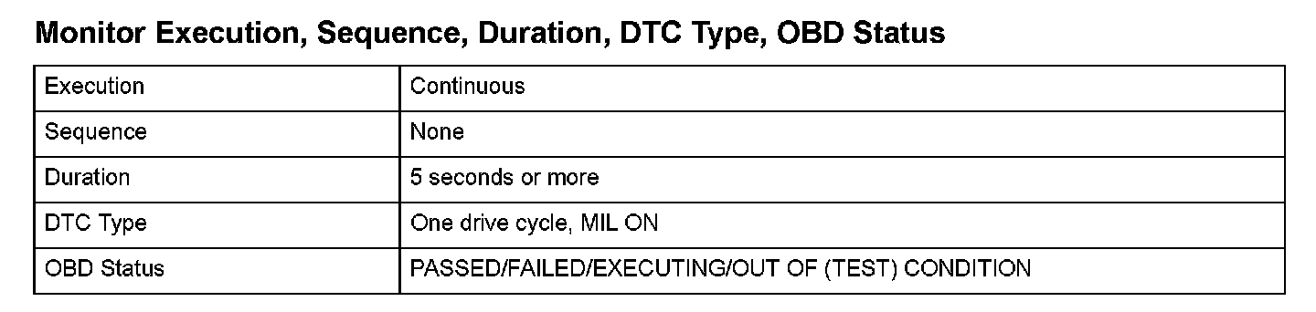 Monitor Execution, Sequence, Duration, DTC Type, OBD Status