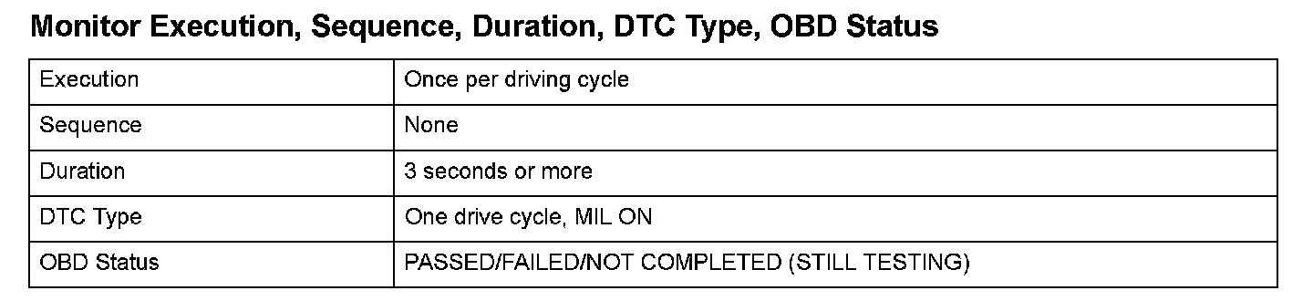 Monitor Execution, Sequence, Duration, DTC Type, OBD Status