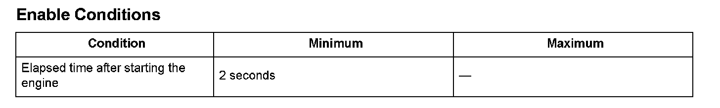 The engine control module (ECM) monitors the FTP sensor output voltage. The FTP sensor output voltage rises as the fuel tank pressure increases. Conversely, the FTP sensor output voltage drops as the fuel tank pressure decreases. If the FTP sensor output voltage is higher than a target value within a set time after starting the engine in a cold condition, the ECM detects a malfunction and stores a DTC.