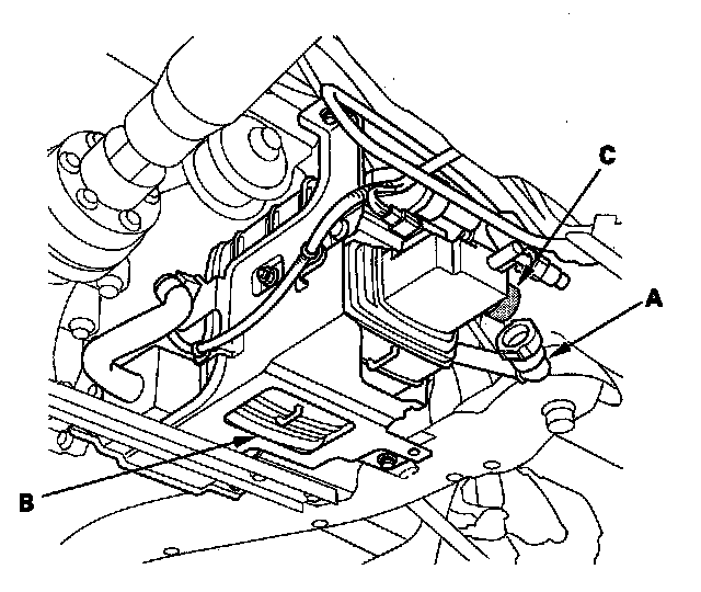 8. Disconnect the fuel tank vapor recirculation tube (A) from the EVAP canister (B), and plug the EVAP canister port (C).