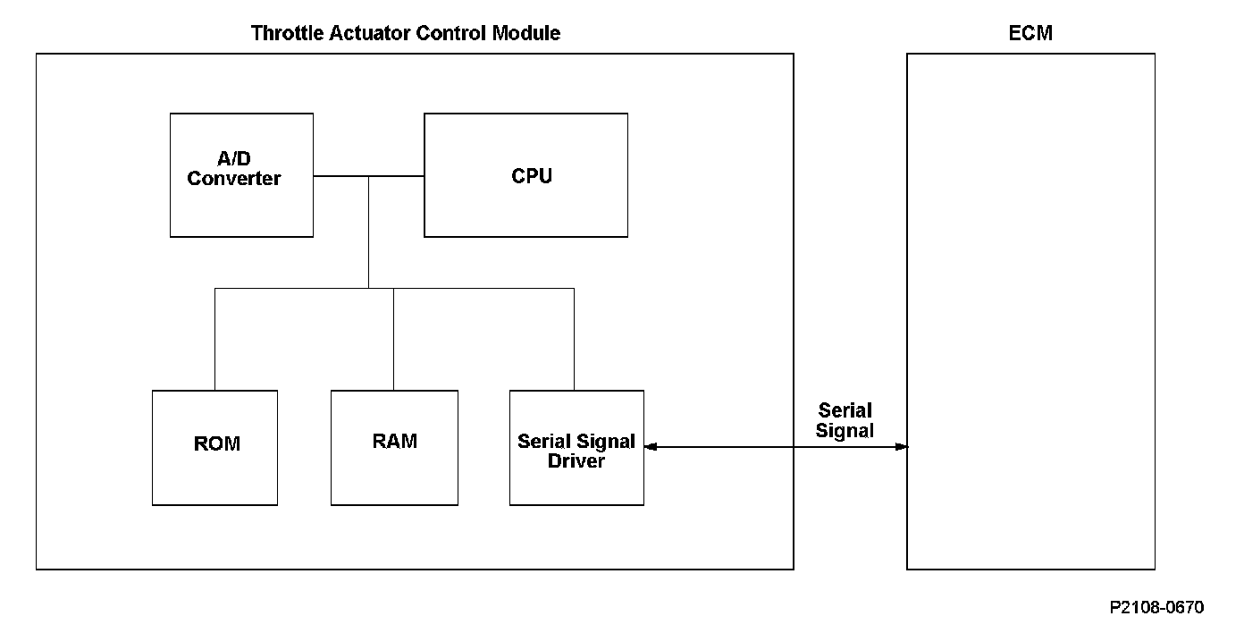 The CPU in the throttle actuator control module performs self-diagnosis for the ROM, the RAM, and the A/D converter. If internal data is found to be abnormal, a malfunction is detected and the malfunction data is transmitted to the ECM. When the ECM receives the malfunction data from the throttle actuator control module, the ECM detects a malfunction in the throttle actuator control module and stores a DTC. When the ECM monitors the serial signal between the ECM and the throttle actuator control module and these signals do not agree, the ECM detects a malfunction and a DTC is stored.