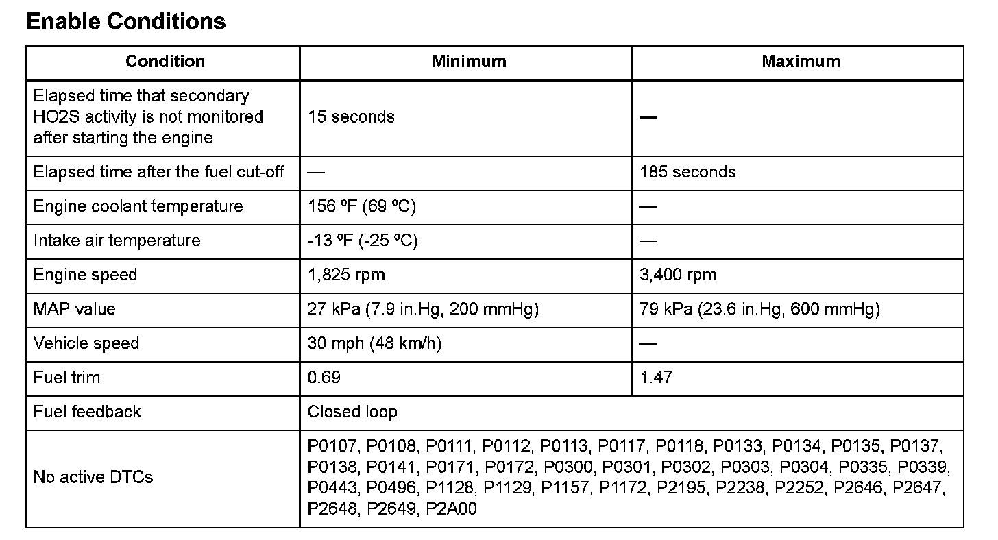 The secondary HO2S output voltage is 0.65 V or less.