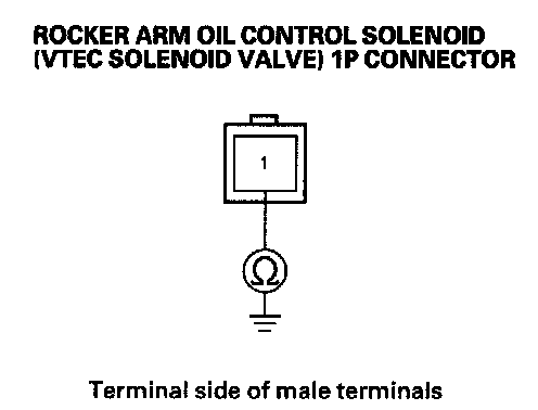 7. At the valve side, measure resistance between the rocker arm oil control solenoid (VTEC solenoid valve) 1P connector terminal and body ground.