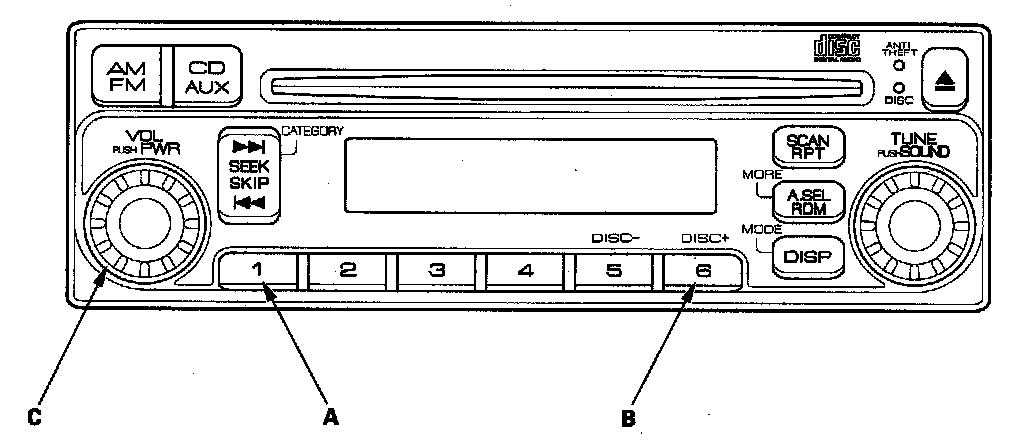 2. With the audio unit turned off, push and hold the No. 1 (A) and No. 6 (B) buttons. While holding the buttons, push the VOL PUSH PWR knob (C) to ON.