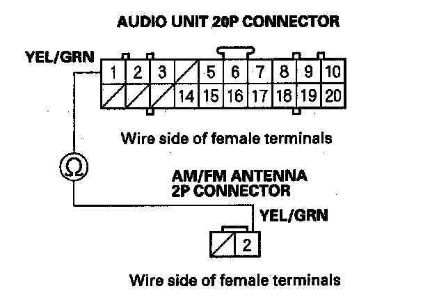 20. Check for continuity between audio unit 20P connector terminal No. 1 and AM/FM antenna 2P connector terminal No. 2.