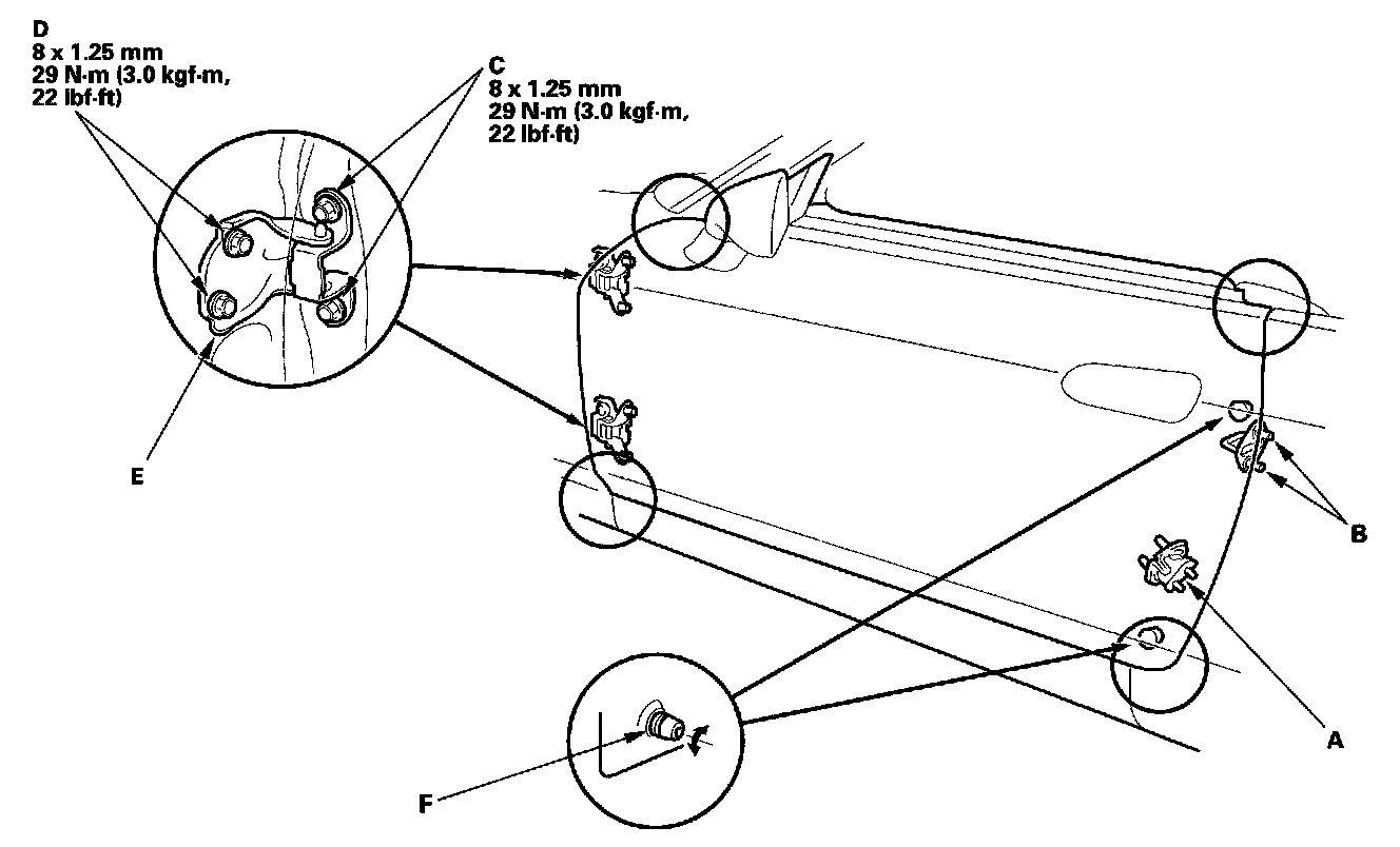 3. If necessary, replace the door mounting bolts (C) and hinge mounting bolts (D) with adjusting bolts (P/N 90101-SZ3-000) made specifically for door adjustment.