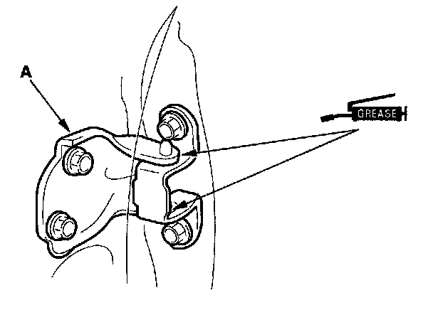 9. Apply multipurpose grease to the pivot portions of the hinges (A) indicated by the arrows.