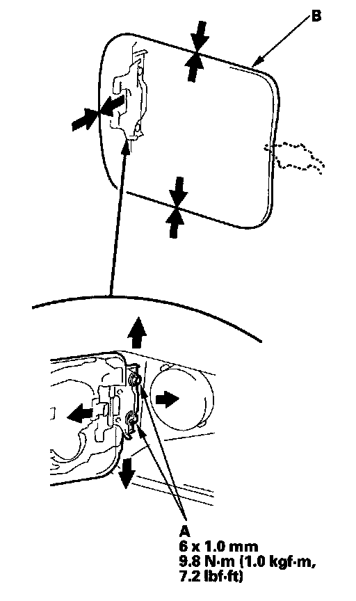 2. Adjust the fuel fill door (B) in or out until it's flush with the body, and up or down as necessary to equalize the gaps.