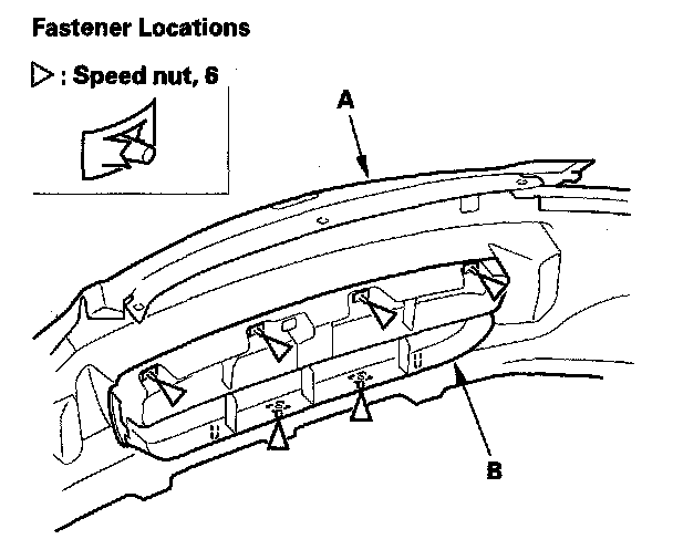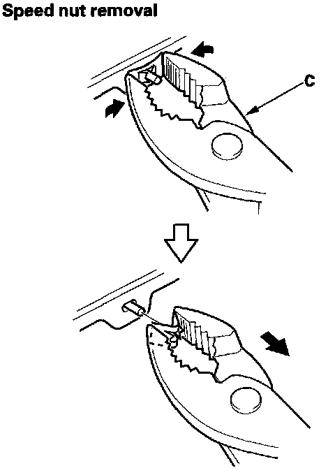 3. From the back of the front bumper (A), release the speed nuts securing the front bumper grille (B) by using pliers (C) as shown.