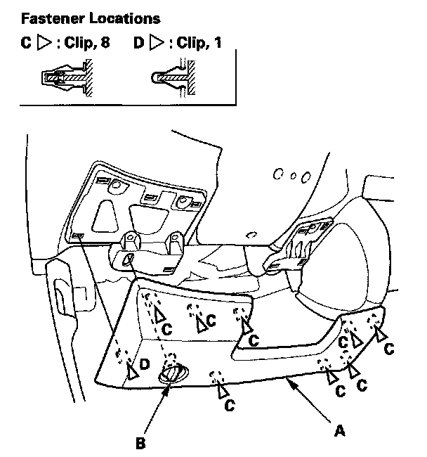 1. Remove the driver's dashboard lower cover (A).