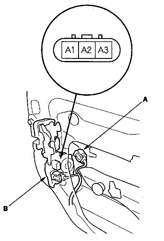 2. Disconnect the 3P connector (A) from the driver's door lock actuator (B).