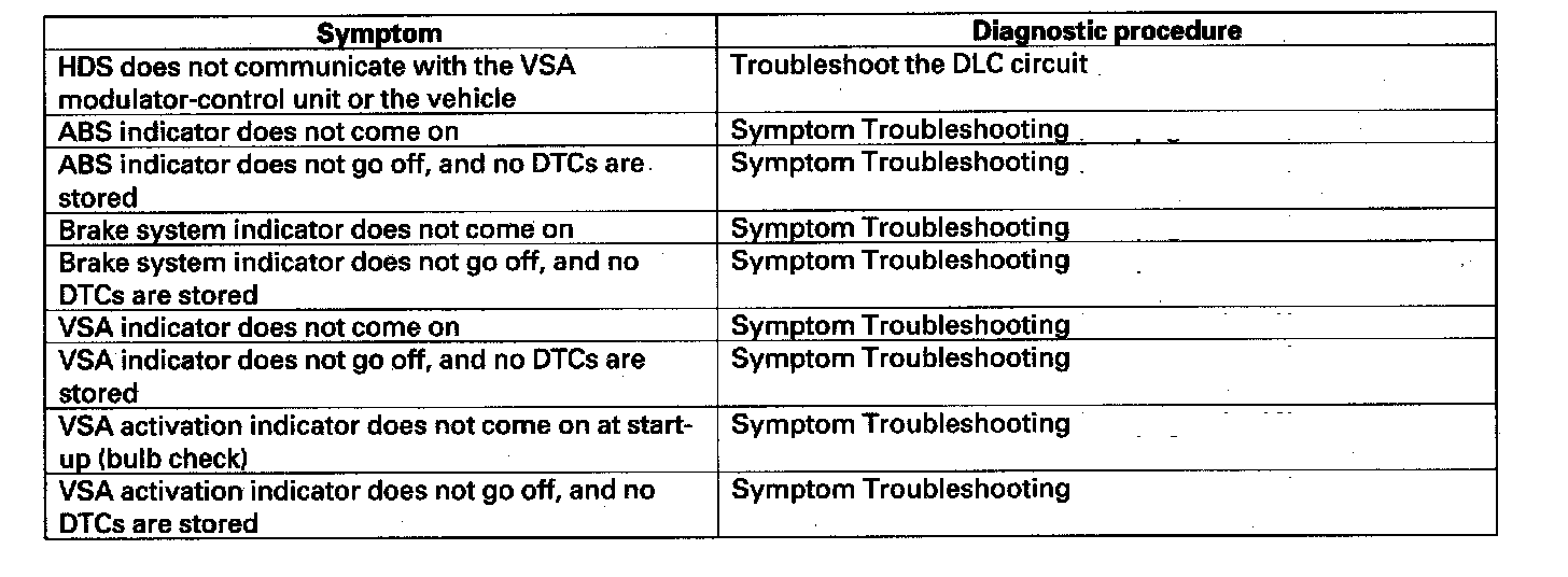 When the vehicle has one of these symptoms, check for a diagnostic trouble code (DTC) with the HDS. If there is no DTC, do the diagnostic procedure for the symptom, in the sequence listed, until you find the cause.