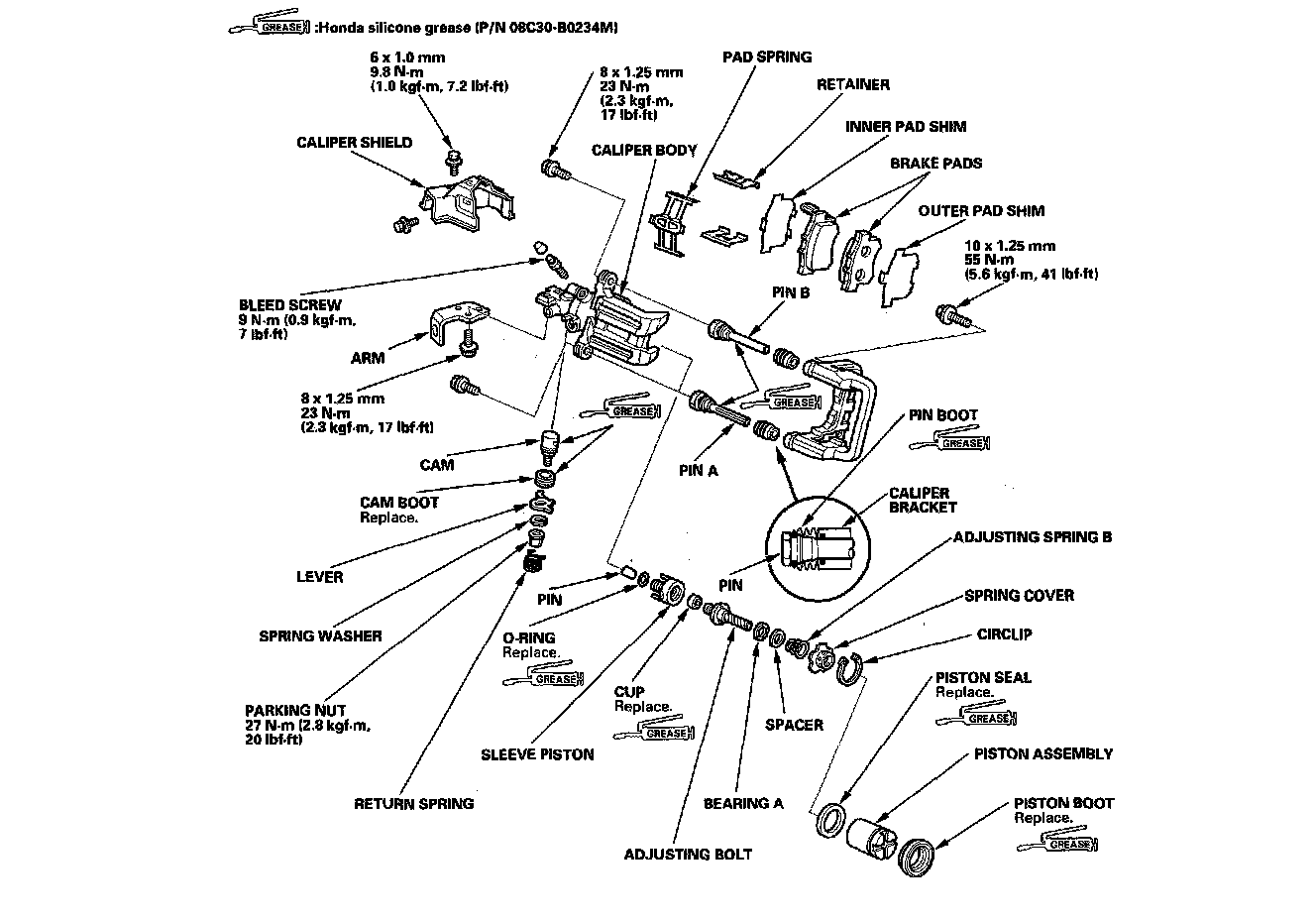 Remove, disassemble, inspect, reassemble, and install the caliper, and note these items: