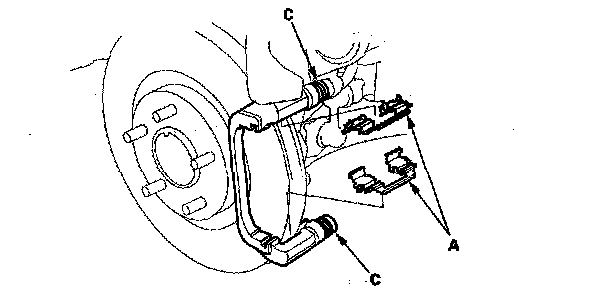 7. Clean the caliper thoroughly; remove any rust, and check for grooves and cracks. Verify that the caliper pins (C) move in and out smoothly. Clean and lube if needed.