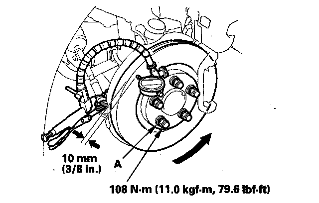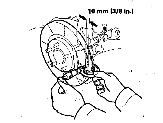 6. Set up the dial gauge against the brake disc as shown, and measure runout at 10 mm (3/8 inch) from the outer edge of the brake disc.