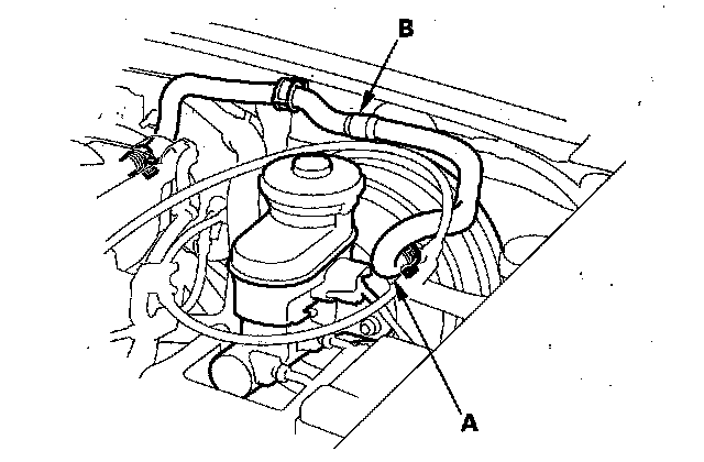 3. Disconnect the brake booster vacuum hose (A) at the booster. The check valve (B) is built into the hose.