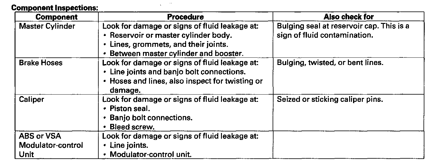 Brake System Inspection and TestInspect the brake system components listed. Repair or replace any parts that are leaking or damaged.