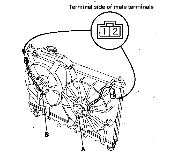 Fan Motor Test1. Disconnect the 2P connectors from the radiator fan motor (A) and A/C condenser fan motor (B).