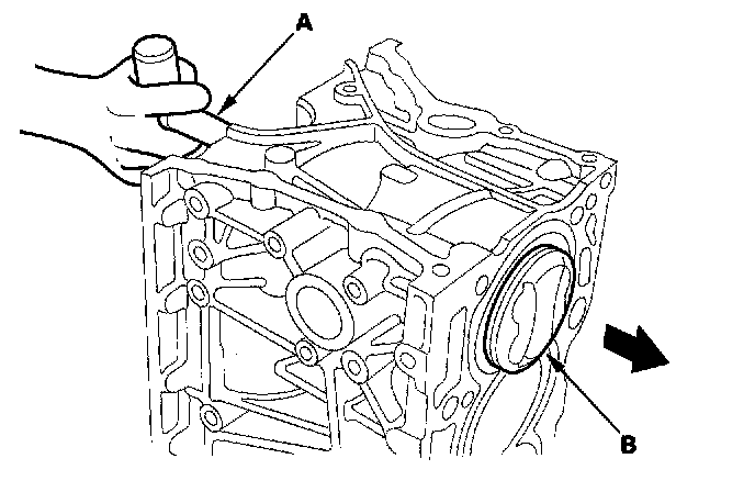 9. Use the wooden handle of a hammer (A) to drive out the pistons (B).