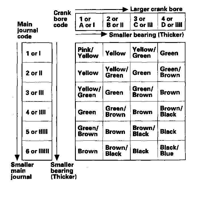 3. Use the crank bore codes and crank journal codes to select the appropriate replacement bearings from the following table.