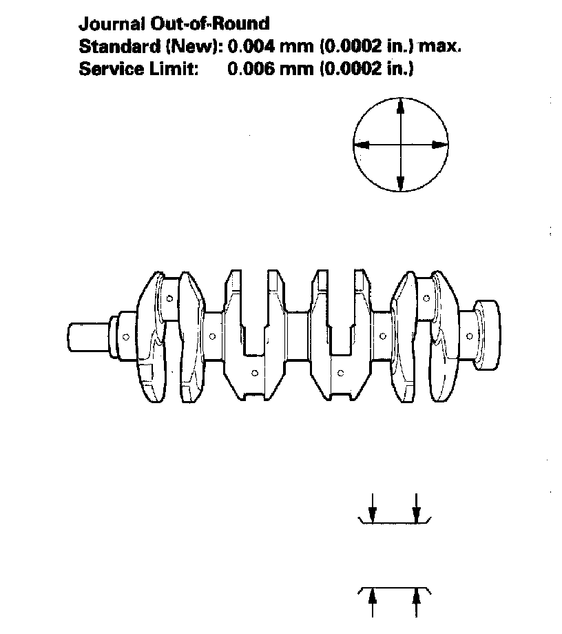 4. Measure the out-of-round at the middle of each rod and main journal in two places of the cross direction. The difference between measurements on each journal must not be more than the service limit.