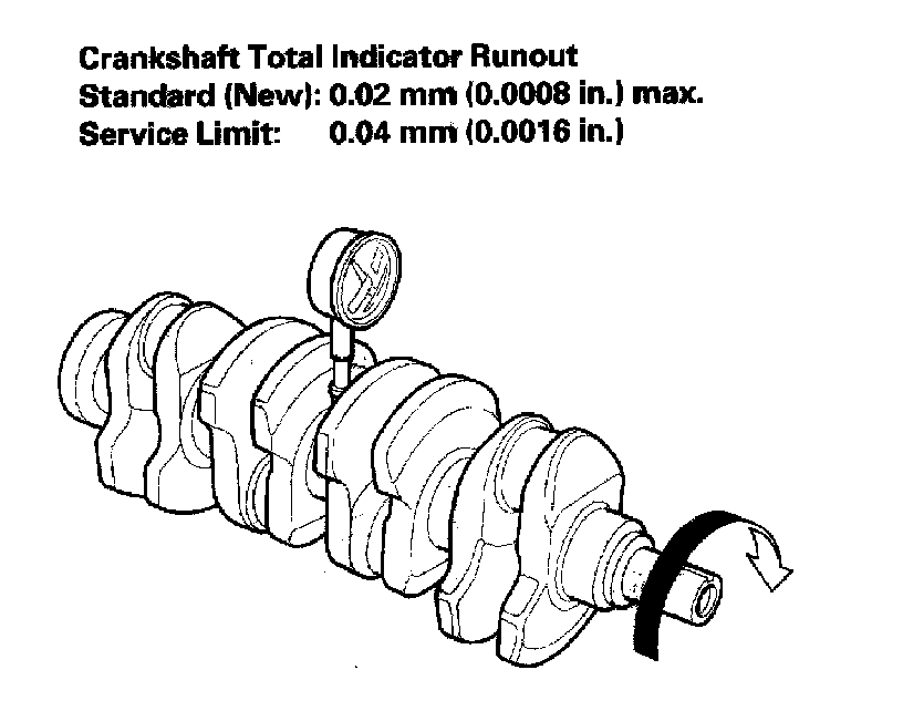 9. Measure the runout on all of the main journals. Rotate the crankshaft two complete revolutions. The difference between measurements on each journal must not be more than the service limit.
