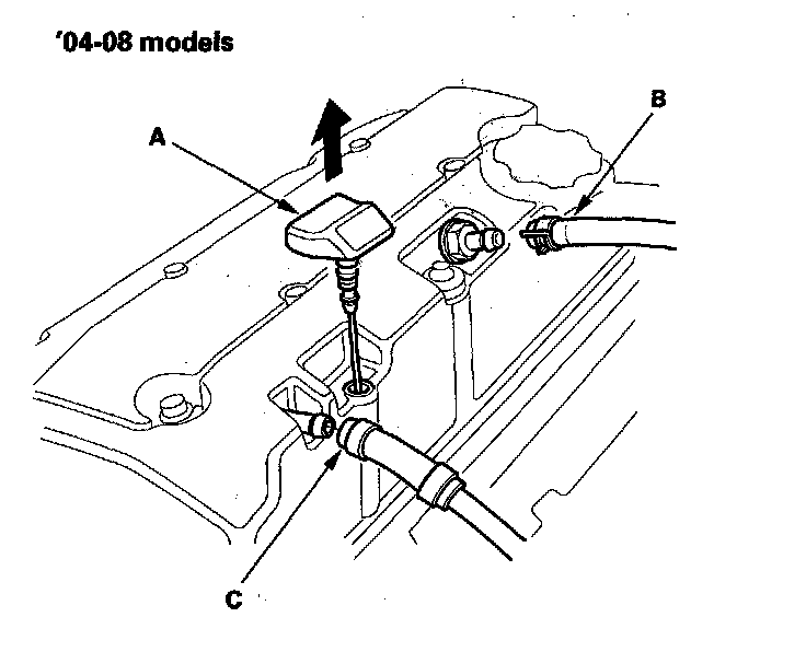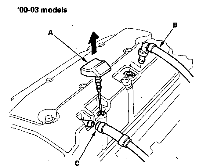 3. Remove the dipstick (A), positive crankcase ventilation (PCV) hose (B), and breather hose (C).