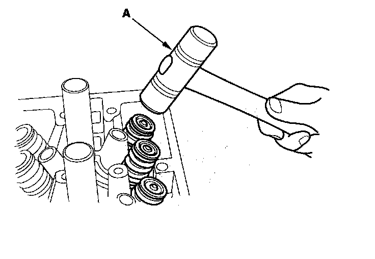 8. Lightly tap the end of each valve stem two or three times with a plastic mallet (A) to ensure proper seating of the valve and valve cotters. Tap the valve stem only along its axis so you do not bend the stem.