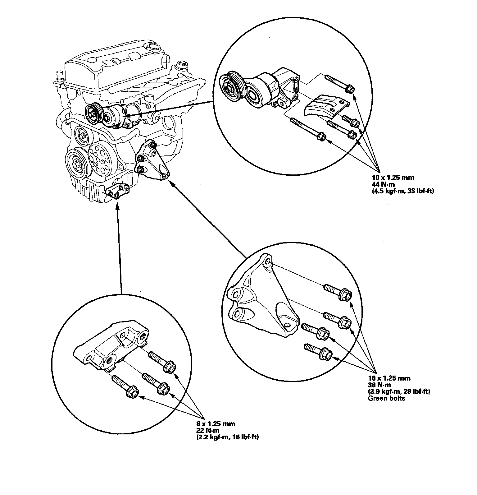 1. Install the accessory brackets, and tighten their bolts to the specified torque.