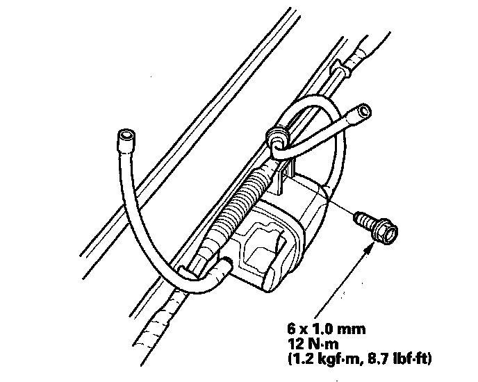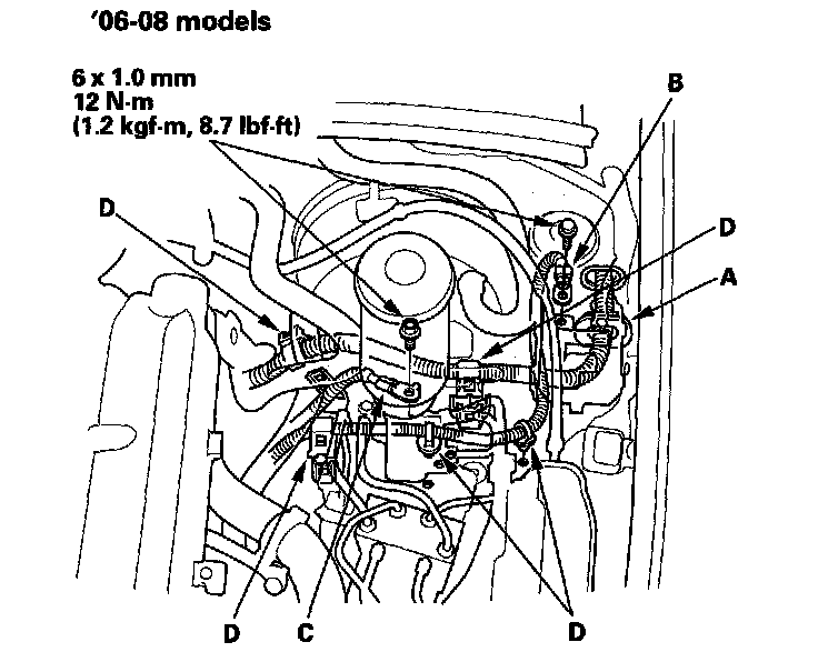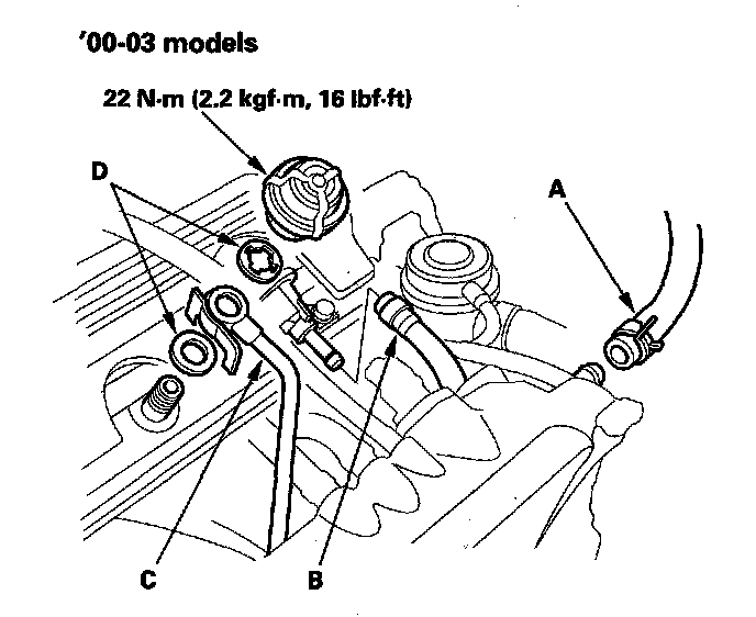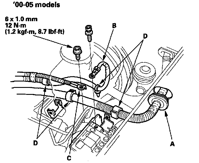 6. '00 - 05 models: Install the brake booster vacuum hose (A), fuel return hose (B) and fuel feed hose (C), using new washers (D).