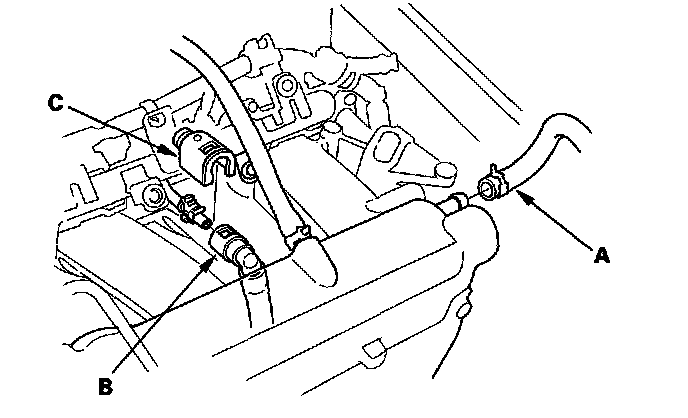 7. '06 - 08 models: Connect the brake booster vacuum hose (A) and fuel feed hose (B), then install the quick-connect fitting cover (C).