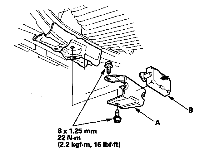 12. Install the engine stop bracket (A), then install the engine stop bracket cushion (B).