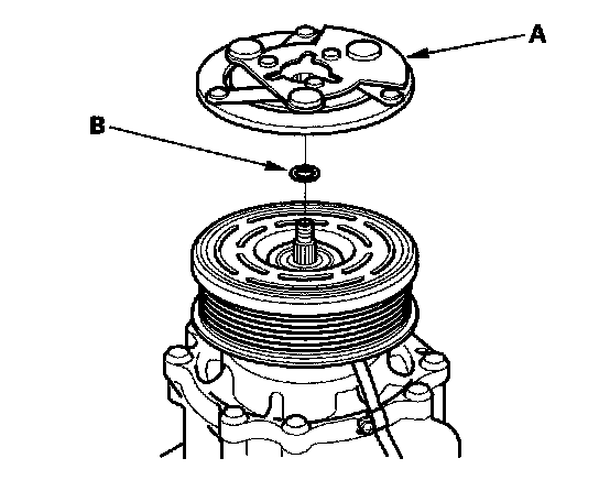 1. Remove the center nut (A) while holding the armature plate with a commercially available A/C clutch holder (B).