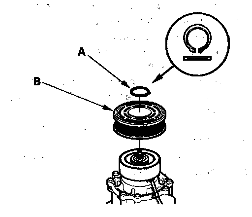 3. If you are replacing the field coil, remove the snap ring (A) with snap ring pliers, then remove the rotor pulley (B). Be careful not to damage the pulley and A/C compressor.