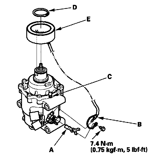 4. Remove the bolt and holder (A), then disconnect the field coil connector (B). Loosen the clamp screw (C) to free the field coil wire. Remove the snap ring (D) with snap ring pliers, then remove the field coil (E). Be careful not to damage the field coil and A/C compressor.