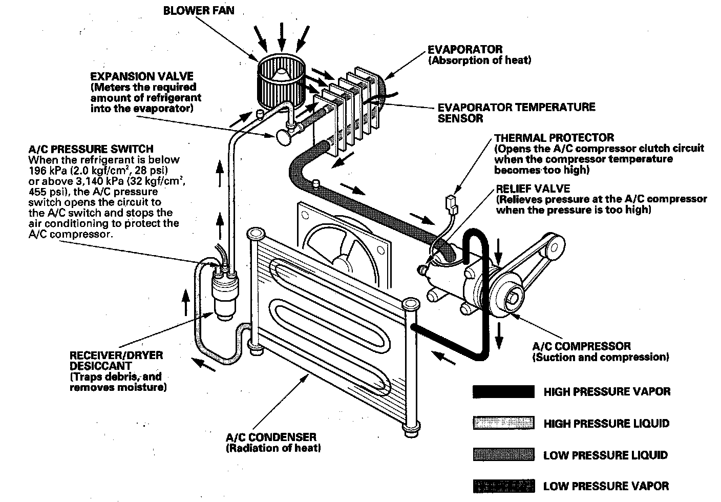 The air conditioning system removes heat from the passenger compartment by transferring heat from the ambient air to the evaporator. The evaporator cools the air with the refrigerant that is circulating through the evaporator. The refrigerant expands in the evaporator, and the evaporator becomes very cold and absorbs the heat from the ambient air. The blower fan pushes air across the evaporator where the heat is absorbed, and then it blows the cool air into the passenger compartment.