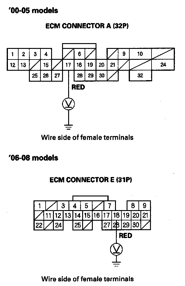 13. Using a backprobe set, measure the voltage between the No. 17 terminal of ECM connector A (32P) and body ground with the ECM connectors connected ('00-05 models) or between the No. 18 terminal of ECM connector E (31P) and body ground with the ECM connectors connected ('06-08 models).