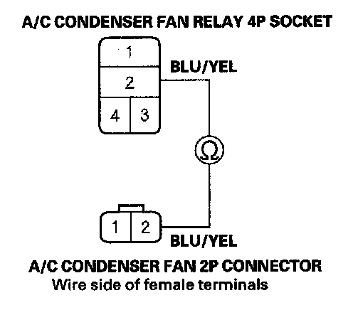 10. Check for continuity between the No. 2 terminal of the A/C condenser fan relay 4P socket and the No. 2 terminal of the A/C condenser fan 2P connector.
