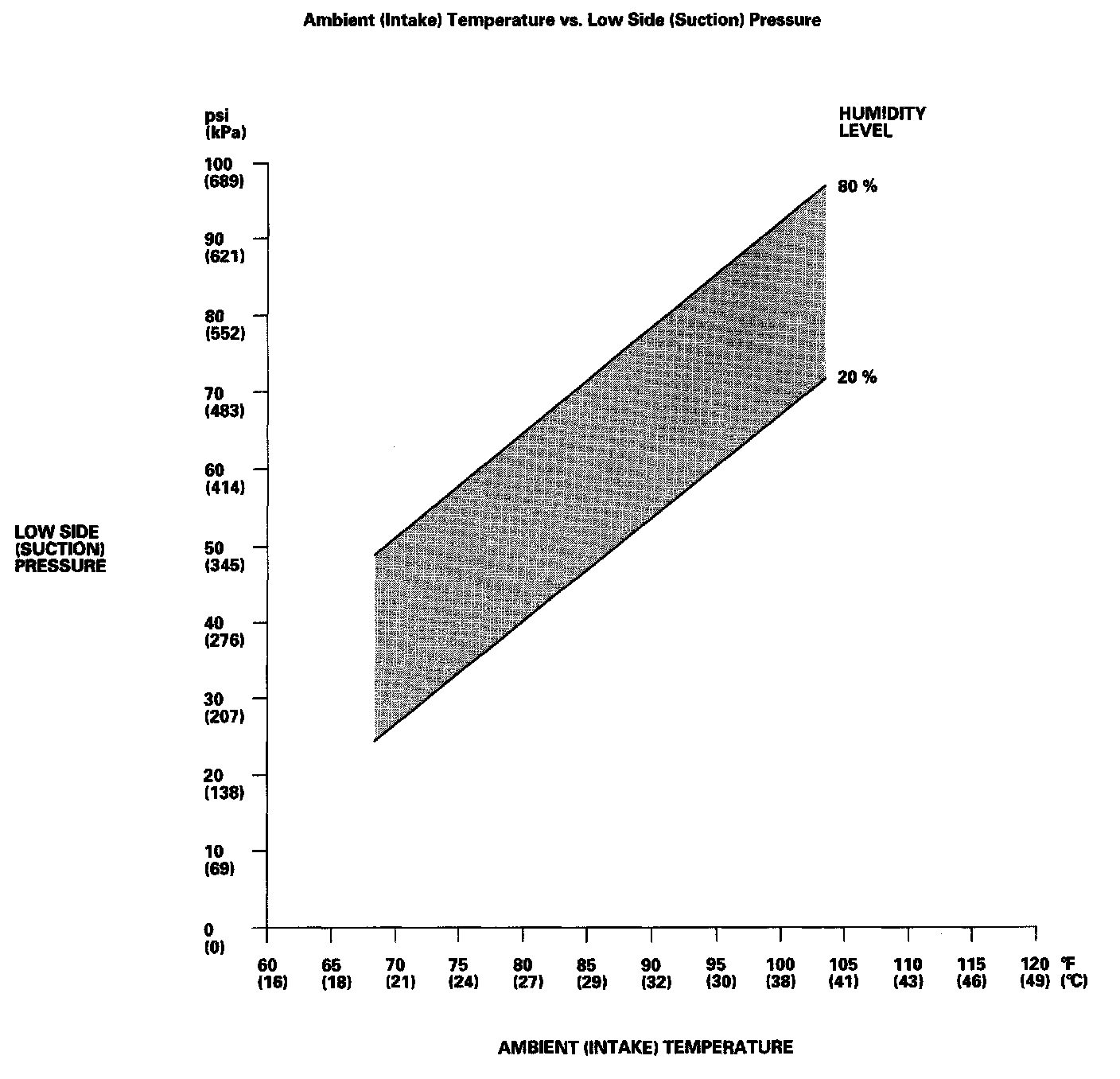 NOTE: The low side and intake temperatures should intersect in the shaded area within about 10% of the measured humidity level. Any measurements outside the line may indicate the need for further inspection.