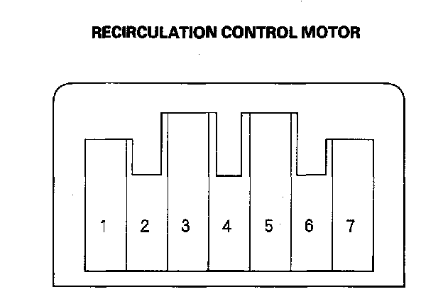 2. Connect battery power to the No. 1 terminal of the recirculation control motor, and ground the No. 5 and No. 7 terminals; the recirculation control motor should run smoothly. To avoid damaging the recirculation control motor, do not reverse power and ground. Disconnect the No. 5 or No. 7 terminals from ground; the recirculation control motor should stop at Fresh (when the No. 7 terminal is disconnected) or Recirculate (when the No. 5 terminal is disconnected). Don't cycle the recirculation control motor for a long time.
