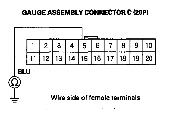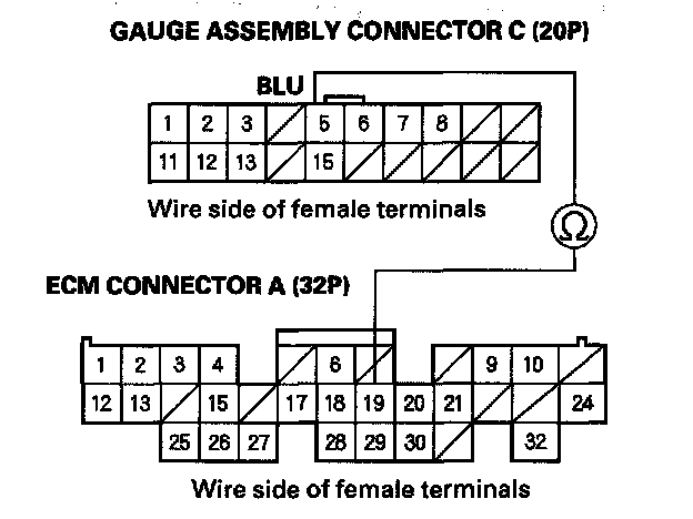 3. Check for continuity between gauge assembly connector C (20P) No. 5 terminal and ECM connector A (32P) No. 19 terminal.