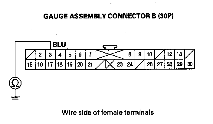 5. Check for continuity between gauge assembly connector B (30P) No. 3 terminal and body ground.