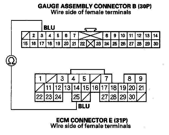 4. Check for continuity between gauge assembly connector B (30P) No. 3 terminal and ECM connector E (31P) No. 25 terminal.
