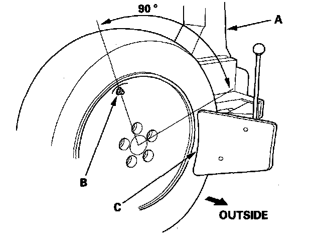 5. Position the wheel so the tire machine (A) and, tire iron (B) are next to the valve stem (C) and will move away from it when the machine starts. Then remove the tire from the wheel.