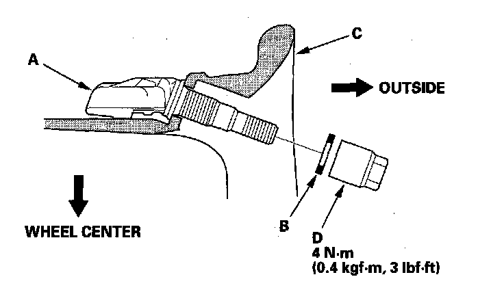 2. Install the tire pressure sensor (A) and the washer (B) to the wheel (C), and tighten the valve stem nut (D) finger tight. Make sure the pressure sensor is resting on the wheel.