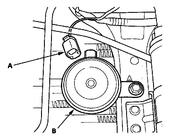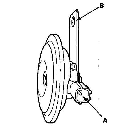 4. Test the horn by connecting battery power to the terminal (A) and grounding to the bracket (B). The horn should sound.