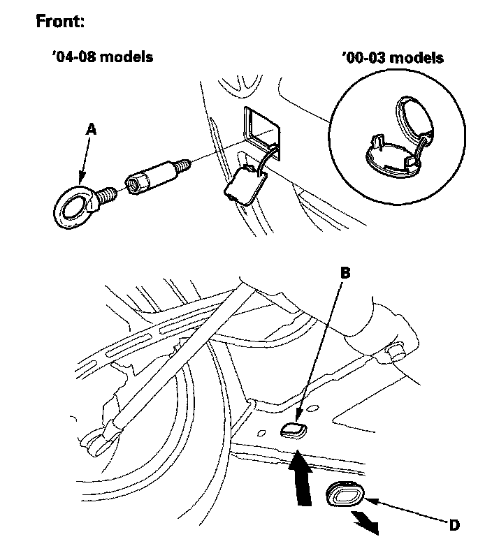 NOTICE: To avoid damage to the vehicle, use the towing hook for straight flat ground towing only. Do not tow at an angle. The towing hook should not be used to tow the vehicle onto a flat-bed. Do not use it as a tie down.