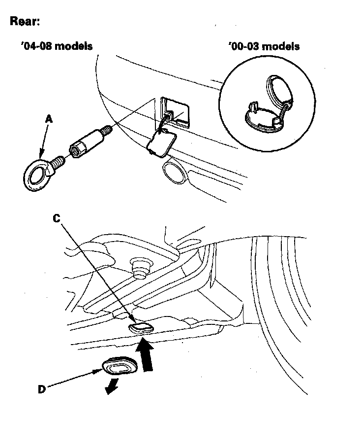 - The tow hook should not be used to tow the vehicle onto a flat-bed. Do not use it as a tie down.